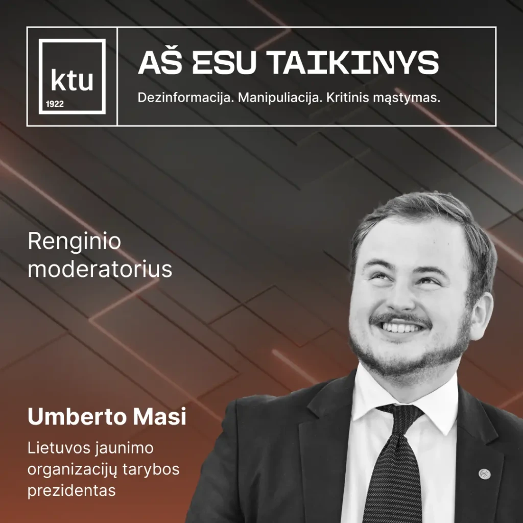 Apie tai, kaip atpažinti dezinformaciją bei manipuliaciją ir kodėl kritinis mąstymas šiandien yra geriausia gynyba, diskutuoti kvies grupės „G&G Sindikatas“ lyderis Gabrielius Liaudanskas-Svaras, LRT Tyrimų skyriaus vadovė Indrė Makaraitytė, žurnalistas Ignas Kinčinas, Lietuvos jaunimo organizacijų tarybos prezidentas Umberto Masi bei KTU Statybos ir architektūros fakulteto dekanas Andrius Jurelionis.